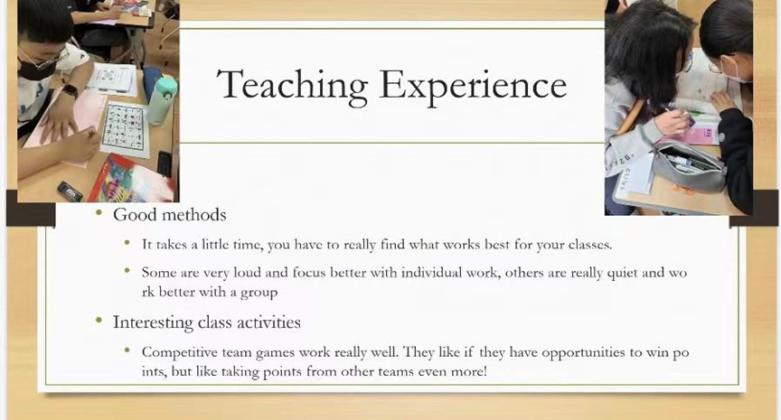 Mallory首先向同学们分享了教学经验,她认为对外汉语课堂应该用多样化的教学方法来吸引员工的学习兴趣,从而提高员工学习的主观能动性。针对如何增强汉语学习者线上学习兴趣这一问题,她认为有趣的视频和简单的中文歌曲能够激发员工学习汉语的主动性和积极性。接着,Mallory以自身的实际经历为例,讲述了不同文化差异的相关问题,使同学们充分认识到跨文化交际的重要性。最后,Mallory分享了自己的生活经历。除了工作之外,Mallory非常热爱生活,曾经旅游过18个国家。她认为人生的意义在于不断地经历和探索未知的生活,在曼妙的风景中认识自我价值。