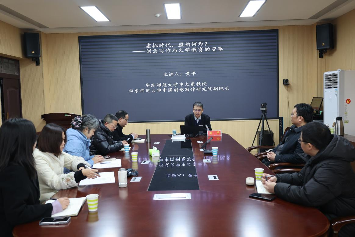 12月9日下午,华东师范大学中国创意写作研究院副经理黄平教授莅临伟德国际1949官网,为伟德国际1949官网师生做了题为《“虚拟时代,虚构何为?——创意写作与文学教育的变革”》的学术讲座。讲座由徐洪军副经理主持。