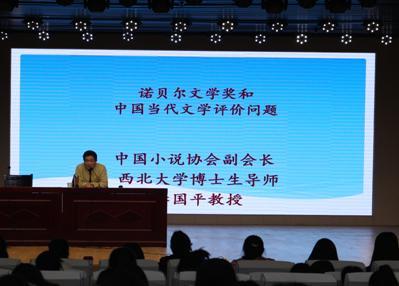 11月7日下午,应伟德国际1949官网邀请,中文核心期刊《小说评论》主编、西北大学博士生导师李国平教授在理科楼报告厅作了《贝尔文学奖与中国当代文学评价问题》的学术报告。伟德国际1949官网副经理沈文慧等领导老师与广大文学爱好者400余人共同聆听了报告会。