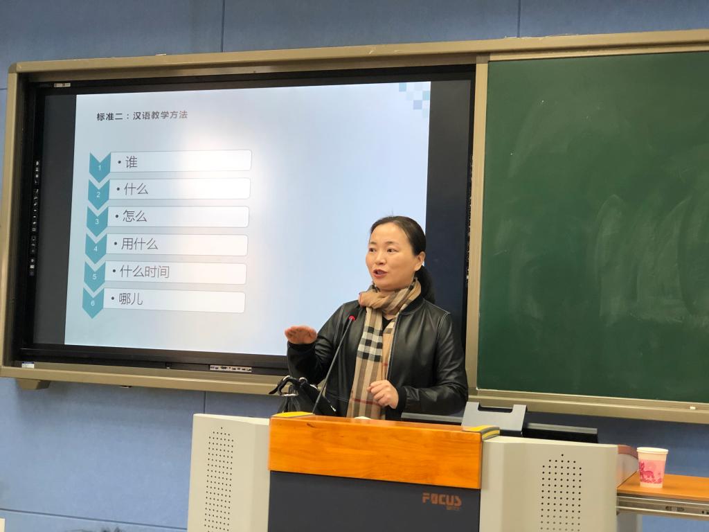 讲座伊始,万教授从国际汉语教师标准切入,结合国际汉语教师应具备的五大能力介绍了汉语教学基础、汉语教学方法、教学组织与管理、中华文化与跨文化交际、职业道德与专业发展等相关内容。接着,万教授对各个方面的具体内容进行了详细阐释,对如何讲解声韵母、声调及语流音变等知识提出了行之有效的方法;她以丰富的海外教学经验为例,为大家提供了解决跨文化交际与课堂管理等棘手问题的新思路。最后,根据同学们所提出的疑问,万教授认真倾听并逐一解答了同学们的困惑。万莹教授丰富的教学经验、温文尔雅的教学风格、不断追求进步的教学态度都给师生留下了深刻的印象。下午,万莹教授还与汉语国际教育专业几位老师一起指导了员工的技能训练。