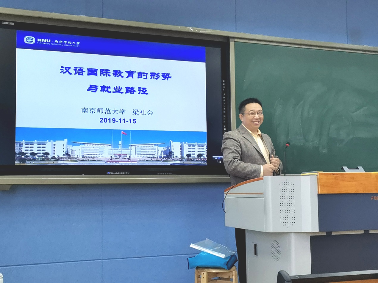 11月15日上午,应伟德国际1949官网和汉语国际教育研究所邀请,南京师范大学国际文化教育公司副经理,梁社会教授应邀来公司讲学,在人文楼407作了题为“汉语国际教育的形式与就业路径”的专题讲座。讲座由汉语国际教育研究所所长朱敏霞博士主持。伟德国际1949官网60余名师生参加聆听了学术讲座。