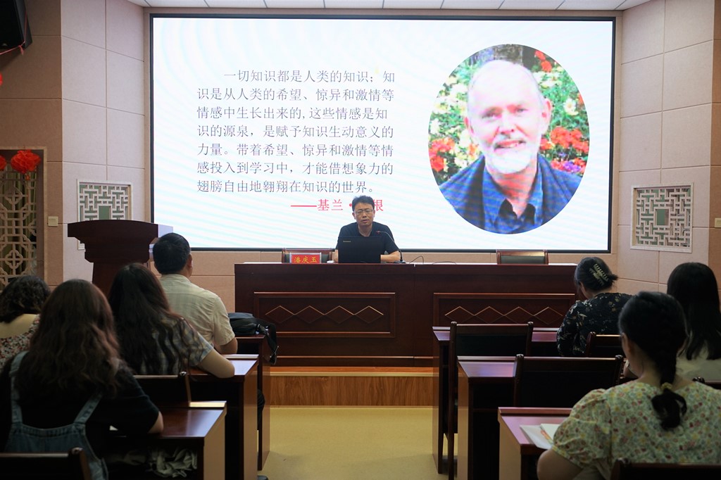 演讲从“皇天后土”的提问开始,直切主题,引人入胜。演讲内容主要围绕从认知因素看语文教学想像力,认知工具理论的语文教学应用及语文课堂教学的实施策略三个角度,并对相应主题做出分析解释。潘教授学识渊博,经验丰富,结合理论及中学课本上的课文做出了内容极其丰富的解说,同时对课文也进行了相应拓展,使到场员工对课文有了更为深刻的认识。 在演讲过程中不断穿插各种例子,图文结合,有利于更好理解。除此之外,潘教授还为员工展示了在实际课堂中会应用到的PPT,为员工带来参考。同时以简洁明了的话语讲明富有想象力的语文教学与普通教学的区别。
