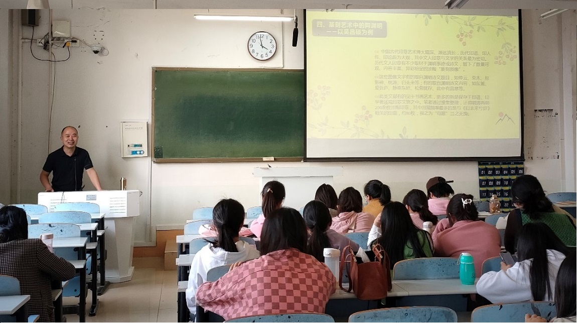 报告伊始,张言军副经理向全体参会师生介绍了刘小兵教授。接着,刘小兵教授分别以中国古代诗歌、书法、绘画和篆刻艺术中的陶渊明主题或元素为切入点,先后介绍了陶渊明这一文化符号在不同媒体中的传播现象。作为文学经典的陶渊明文化符号,对它的跨媒介研究,不仅仅可以发觉其形象在不同的艺术形式中所呈现的鲜明特点,也印证了陶渊明这一文化经典所具有的强大再生力和影响力。随后,部分研究生与刘小兵教授针对报告的相关问题交流了个人观点。刘小兵教授的讲解深入浅出、表达方式幽默诙谐,在场师生都受益颇多。