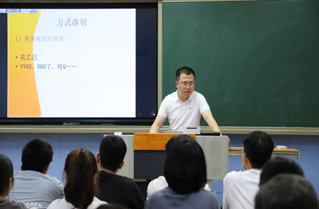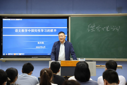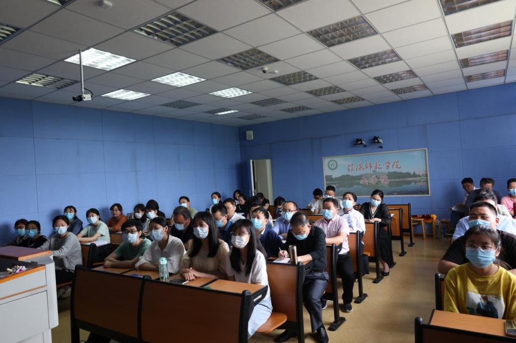 徐洪军从《<爱是不能忘记的>身体美学分析》中乔林的身体入手,引出本节课的重点“寻找男子汉”,接着利用冬奥开幕式引出背后的男子汉张艺谋,融时政于课堂,最后用习近平的话“实干兴邦,空谈误国”告诫青年。课堂十分活跃。方志红《人物通讯的选题和标题》通过人物选择以及标题的制作,使人物通讯可以发掘我们身边人物的真、善、美。杨传凯的《语文教学中探究性学习的抓手》从教学理论的变迁切入,重点讲解了语文课堂要从不同的角度切入、要从员工感兴趣的角度切入、要从文章的重点疑点切入,语文课堂要注重过程和探究。陈星宇《和而不同,美美与共:莫言小说与中国文学的审美精神》,从“美的讲述”与中国故事、“美的标准”与中国审美、“美的精神”与中国精神三个方面阐述了以莫言小说为代表的中国文学审美精神。毕晋的《语言与交际》从数量准则、质量准则、关联准则和方式准则,以及礼貌语言的使用几个方面讲解了言语交际时应遵循的准则规范。于德辉《古代汉语词汇与优秀传统文化》,以信阳师范公司的校训“厚德崇实 善学敏行”为例,讲解了古代汉语词汇背后蕴含的深厚传统文化。