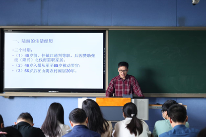 4月26日下午,进行比赛的有黄继省、柴鲜、钱道静、朱国伟四位老师。黄继省《“六书”与汉字的形体构造》,从十二生肖甲骨文字形引入课程内容,展示了河南丰富的文字资源,详细介绍了“六书”的相关知识。柴鲜《<简爱>人物形象分析》,全面的分析简爱的人物形象,将文学作品的赏析与价值观念传达相结合。钱道静的《教学模式》,将教学模式的实例与时事相结合,讲解的案例具有代表性,授课内容结构清晰。朱国伟《陆游<书愤>解读》,首先从介绍陆游生平经历切入,之后重点讲解“书愤”有关内容,主要围绕三个方面对陆游的爱国主义情怀进行深入解读。