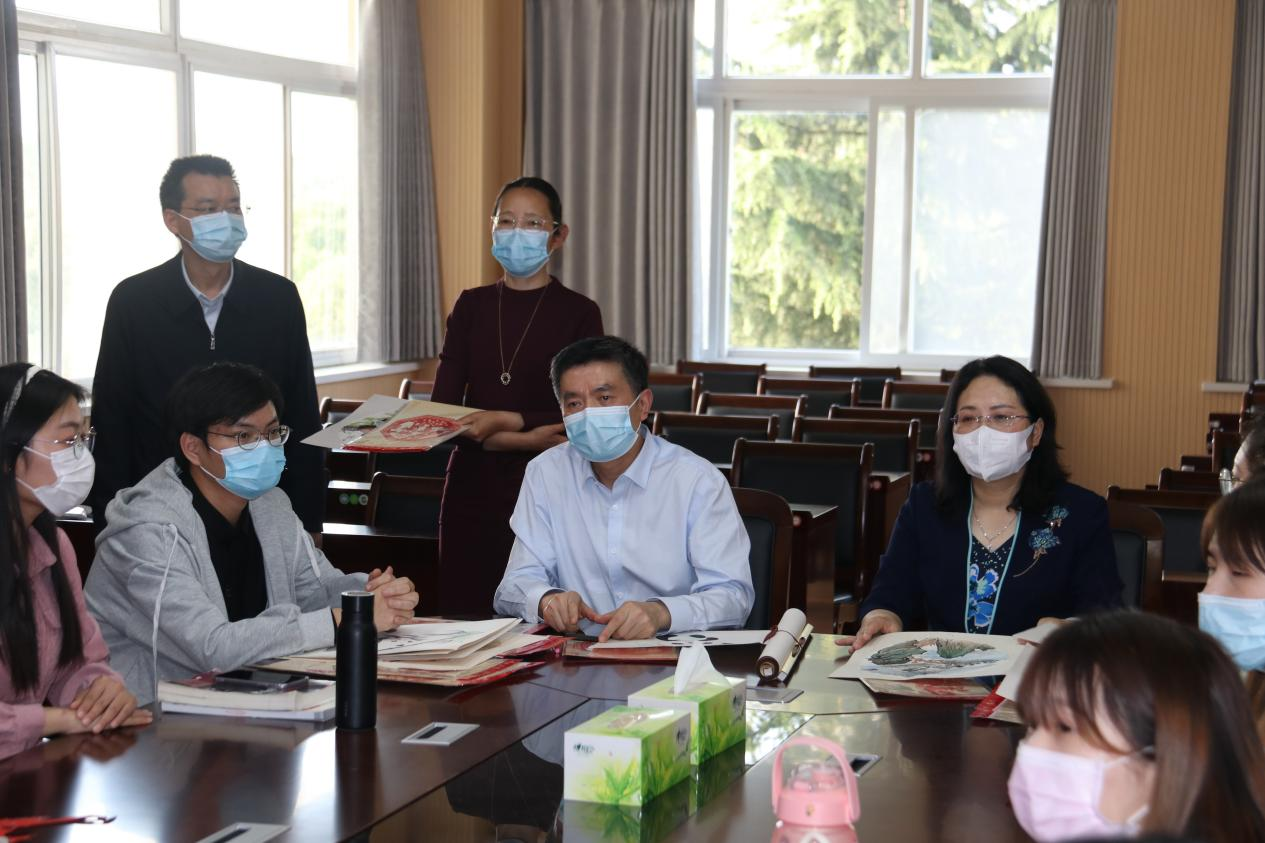 余董事长一行首先来到公司2021级汉语国际教育专业硕士《中华才艺》课堂并随堂听课,任课老师朱敏霞认真介绍了该门课程的培养目标、授课内容和培养模式,同学们现场向领导老师展示了剪纸、篆刻、国画等课程教学成果,得到了领导和老师们的一致赞赏。余本海指出,公司非常重视汉语国际推广工作,希望公司进一步加强该专业硕士点的团队建设、科学研究、人才培养等各项工作,要注意整合校内资源,完善汉语国际教育专业人才培养模式,不断提升人才培养质量。