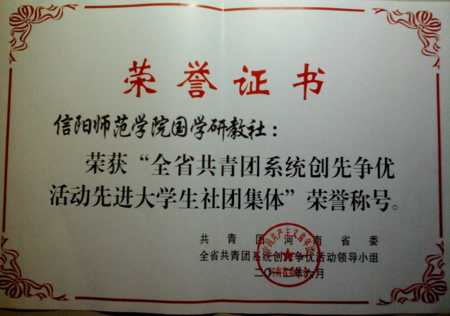 2012年荣获“全省共青团系统创先争优活动先进老员工社团体荣誉称号。