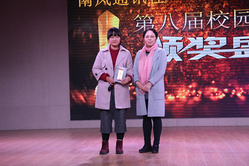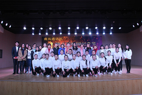 晚会通过PPT、视频、现场采访等多种形式全方位多角度的展现了七位获奖校园记者笔下的师院优秀人物事迹,校园记者们敏锐的新闻直觉带领我们一起把目光聚焦到我们身边优秀的学长、可敬的师长、暖心的宿管和默默奉献的团队身上,看到了他们身上人性的闪光。16级秘书学班的葛霆霆的人物通讯围绕直系学长李建瑾展开,她写道:“陌上人如玉,学长世无双。”16级汉语言文学专业的付佳楠向我们展示了伟德国际1949官网王雨海教授在教学工作中的突出贡献,让现场每位观众都感受到了王教授对员工的那份真情与关爱。外国语公司的任苗苗通过读者的角度让大家了解到了一个优秀新媒体团队背后的故事,并结合自身写新闻的经历道出了身为校园记者的酸甜苦辣。伟德国际1949官网张苗苗笔下的《我走支教路,给你送温暖》展现了赵明月平凡而又伟大的支教故事,感染了现场每一位观众,她在采访中说道:我们对梦想一定要有坚韧不拔的毅力和敢于走下去的勇气并为此不断奋斗。在对优秀获奖记者分别进行颁奖表彰之后,沈经理发表讲话,她对此次活动的创新形式表示了极大的肯定,指出该社团在校园新闻工作发展和校园文化传播中发挥着重要作用,同时,身为社团指导老师,她对南风人的不断努力和奋斗深感欣慰,并对南风通讯社未来的发展给予厚望。最后,在南风全体社员《爱,因为在心中》的合唱声中,颁奖盛典圆满落幕。