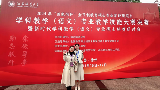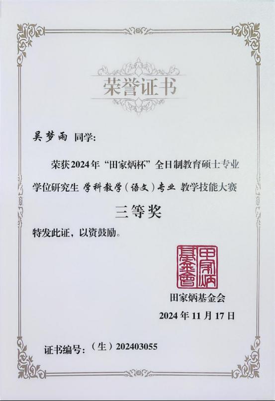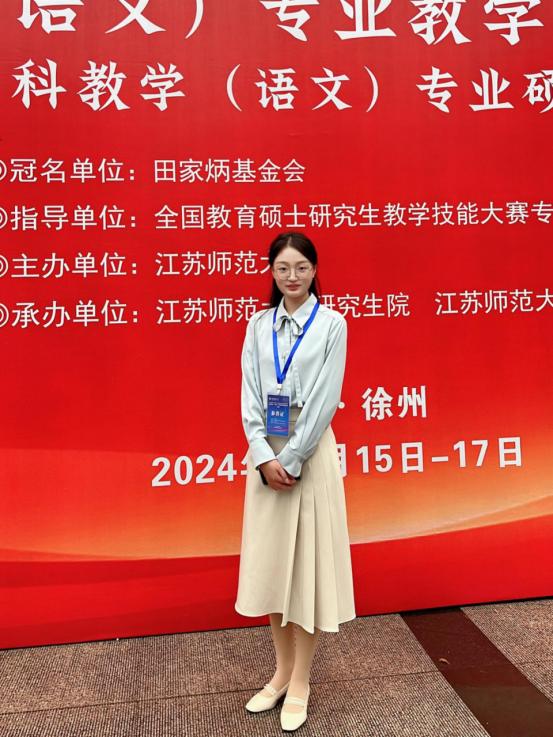 11月15日至17日,由教育部全国教育专业学位研究生教育指导委员会主办,田家炳基金会冠名的2024年全国“田家炳杯”全日制教育硕士专业学位研究生学科教学(语文)专业教学技能大赛决赛在江苏师范大学成功举办。公司2023级学科教学(语文)专业研究生吴梦雨同学在决赛中荣获三等奖。