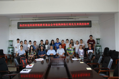 会议伊始,白书记对李祖鹄先生和张仕培先生的到来表示热烈欢迎,接着,李老先生邀请白书记和蔡亚玲老师一同为受助生发放助学金,并合影留念。