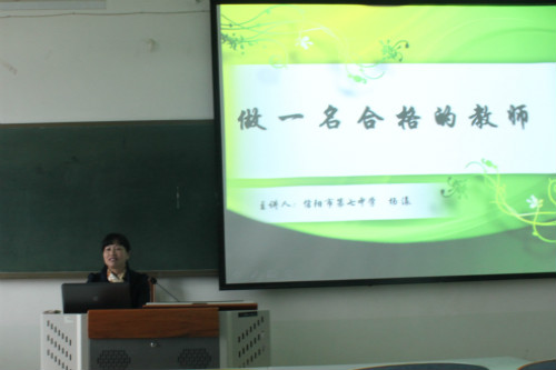 杨漾紧扣报告会主题,从教师的现状与职业认知、教师的爱与幸福、教师的责任与师德、教育的智慧和教师的成长五个方面展开全面讲解。她简要介绍了信阳地区的教师教育现状,结合自身三十九年的从教经历,指出教师职业面临的工作时间长、教学任务繁重、多学科任教等一系列问题。她强调,为学与做人并重,教育的价值是培养员工,帮助员工塑造健全的人格。为实现教育的价值,教师必须具备良好的思想品格和道德的修养,课上要充当传递知识的使者,课下要做好为人师表的典范。杨漾认为教师要有责任心,只有教师的勤奋才能鼓励员工的勤奋,只有教师的言传身教才能调动员工的学习积极性和主观能动性,同时,教师要选择正确的教育方法,积极与员工交流,理解并包容员工,作员工思想的向导,使他们从知之不多走向知之甚多。作为一名合格的教师,既然选择教师职业就要脚踏实地地走下去,树立教师的崇高信仰,追求教师的高尚情操,成就教师职业的辉煌。她引用以爱心育人著称的教师斯霞的故事,彰显教师无私奉献、爱岗敬业的高尚品格和光辉形象。杨漾深刻睿智的讲话、幽默风趣的语言、鞭辟入里的分析赢得在场师生的一致好评,现场掌声不断。