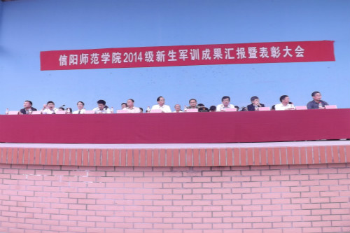李义凡宣布信阳师院2014级新生军训成果汇报暨表彰大会开始,并一一介绍与会领导。随后,大会进行第一项,军训成果汇报表演。参加军体拳表演的各方队有序上场、迅速散开、准确定位,同学们上步坚定、出拳有力、转身利落。表演过程中场面蔚为壮观,统一的着装、响亮的口号、恢弘的阵势、整齐划一的队列、连贯一致的动作,直教人拍手叫绝。接着,伴随着雄浑的歌曲,来自19个院系的71个方队依此上场。他们口号嘹亮、步调一致、斗志昂扬、信心十足,充分展现了老员工意气风发、青春洋溢的精神面貌。汇报表演结束之后,孙宏典亲自为承训部队赠送锦旗。
