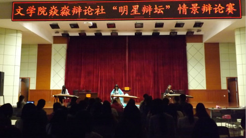 辩论赛在轻柔和缓的古筝弹奏《青花瓷》中拉开帷幕。为突出辩论社特色,此次辩论赛创新原有辩论赛形式,将情景剧与辩论赛相结合,一改原有辩论赛严肃的面貌,使得整场辩论赛精彩绝伦,高潮迭起。在第一场辩论赛“猪八戒和孙悟空那一个更适合做老公”中,身着正装、士气高涨的辩手们依次做简明扼要的自我介绍后正反方展开激烈辩论。正方辩手通过对猪八戒和孙悟空的外貌、能力、性格三方面进行比较得出“孙悟空更适合做丈夫”的结论,而反方则认为猪八戒更能为家庭稳定提供必要的物质基础,带给妻子更多的精神满足,因此更合适做丈夫。辩论中正反方辩手各持己见、据理力争,紧抓漏洞、极力反驳。攻辩环节中,攻方言辞犀利、问题刁钻、针锋相对,而辩方以退为进、接连反攻,步步逼近,双反辩得不可开交。自由辩论更是将全场氛围推向高潮,辩手们诙谐幽默的语言、灵活巧妙的现场发挥引得在场观众捧腹大笑、掌声不断。第二场辩论赛 “老员工应该花更多的时间努力学习还是穿着打扮”同样精彩纷呈。专注读书的学霸方和花枝招展的美女组一经上场就令人耳目一新、兴致十足。正方学霸认为老员工理所当然地应该花更多的时间努力学习,而反方美女们则理直气壮地坚持对老员工而言穿着打扮比努力学习更重要。双方辩手的伶牙俐齿、绝妙口才、独到见解、大胆想法、精湛演技、逗笑表演,将辩论与情景完美融合,带给观众一场别开生面的视听盛宴,台下欢笑声、喝彩声、掌声不绝于耳。