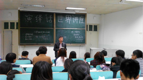 王雨海教授将个人之于话剧世界分为三个层次:理解话剧、学习话剧、融入话剧。他从话剧的起源地古希腊讲起,详解了从希腊神话中的酒神狄奥尼索斯,到莎士比亚,再到易卜生等人对中国近现代戏剧的重大影响。在此基础上,王教授进一步从形式、内容、发展等方面对中西话剧进行了比照,为现场同学呈现了广阔深厚的的话剧演变历史。同时,他建议同学们平时多读《戏剧技巧》、《斯坦尼•斯塔夫斯基文集》、《焦菊隐文集》等经典作品,以此来切实提高自身体悟及表演话剧的能力。在融入话剧方面,他认为话剧是对人生重大意义和奥秘的探索,要融入话剧,就要把话剧与人生联系起来,体会话剧与人生互有裨益的关系。“人生如戏,我们都要去演好自己的角色,才能成功。”王教授如是说。王雨海,教授,信阳师院校级重点学科现当代文学学科带头人。长期从事该校晨曦话剧社话剧排演指导工作,在其指导下公演的经典剧目《日出》、《原野》《家》等,对人性及情感进行了深刻的探讨,并为师院员工带来深层次的反思,产生了巨大校园影响力。(编辑 辛甜甜 高笑蕊)
