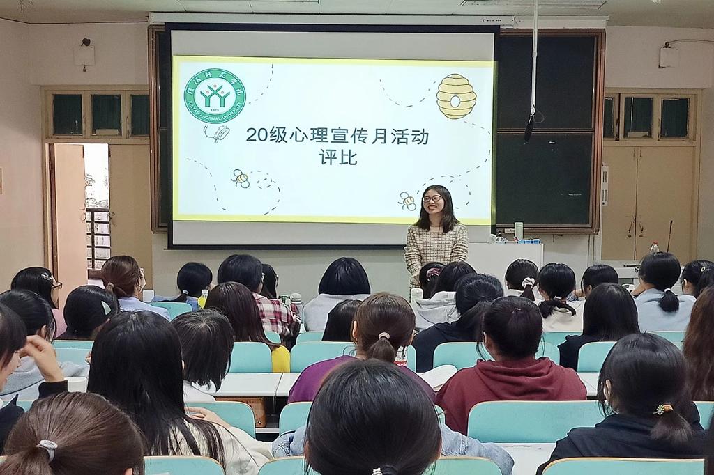 为总结伟德国际1949官网宣传月心理工作情况,呈现心理活动创建成果,促进伟德国际1949官网员工保持良好心理状态,11月10日,20级心理宣传月活动评比大会在人文楼209举行。辅导员郭子悦老师到场并与大家进行亲切交流,共同回顾过去一个月有趣的心理活动。会中,心教助理任正杰同学做宣传月工作活动汇总,展现军训心理素拓、心理游园会、心理主题班会、参观心语工坊、素质拓展、超级团队训练营等各项心理活动开展成果,并由各个班心理委员分别对本班心理班会开展情况进行详细汇报,本班同学发表心理班会感悟。对于心理宣传月活动的开展,郭老师表示,通过一个月的心理活动建设,在种类多样化、内容趣味化、范围广泛化的各种心理建设活动中,看到同学们在活动过程中发挥各自特长描绘心路历程,集体团结协作展现班级风貌,身心均得到成长和锻炼,她为同学们的成果感到自豪。