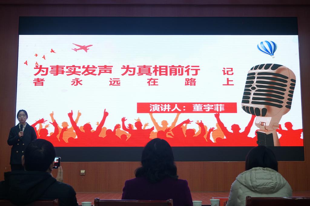 晚会开始,一首慷慨激扬的《记者赋》朗诵,为我们展现当代记者的责任与担当,使命与理想。参赛选手们着眼社会发展现状,讲述一个个中国故事,讲述中国故事背后的新闻人,讲述那些首当其冲、令人触动的记者事迹。刘皓月同学为我们带来战地传奇刘骁骞的敬业精神和元气满满王冰冰的真诚亲和。“无声起惊雷,落笔展风华”潘枚羽同学为我们展现当代记者应有的风采与激情。铿锵有力的演讲,是朴帅同学为我们讲述钟南山院士的抗疫征程。强玉洁同学以“生命不止,心火不熄”提出自己对于记者的期待和向往。郑嘉颖同学结合当代记者事例,展现出记者在时代背景下的重要作用,以温热敏锐的心报道真实的世界。董宇菲同学在讲述记者故事的同时,提出记者应当具有的优秀品格和重要使命。立足当下,亲身实践。丁默渲同学通过策划调查采访,切实体会到记者所承载的期待与使命。马菲演讲中的记者们,将“四力”内化于心、外化于形,将草鞋精神发扬光大。“天道酬勤,功不唐捐”,“平凡不等于平庸”,崔菀芯同学带领大家认识一个个平凡却不平庸的人们,鼓励大家脚踏实地,勇于承担起自身的责任与使命。“脚下有泥,眼中有光,肩上有责任”,这是选手们对记者鲜活的描述。对于记者来说,摄像是用来记录人生轨迹,镜头是用来捕捉真实生活,话筒是用来采访事实真相。一名优秀的记者,是能够公平公正,始终坚守职业岗位,永远第一时间为人民带来真实可靠的消息来源的人。晚会过程中,参赛选手们的演讲获得台下观众的阵阵掌声。