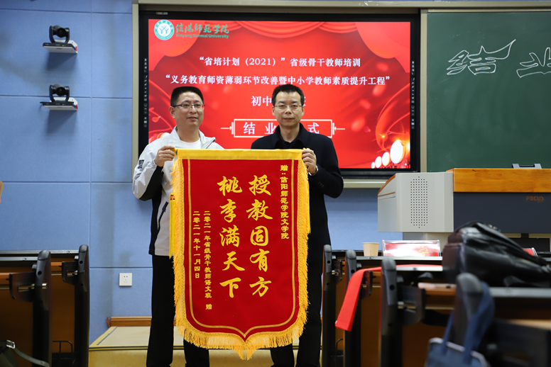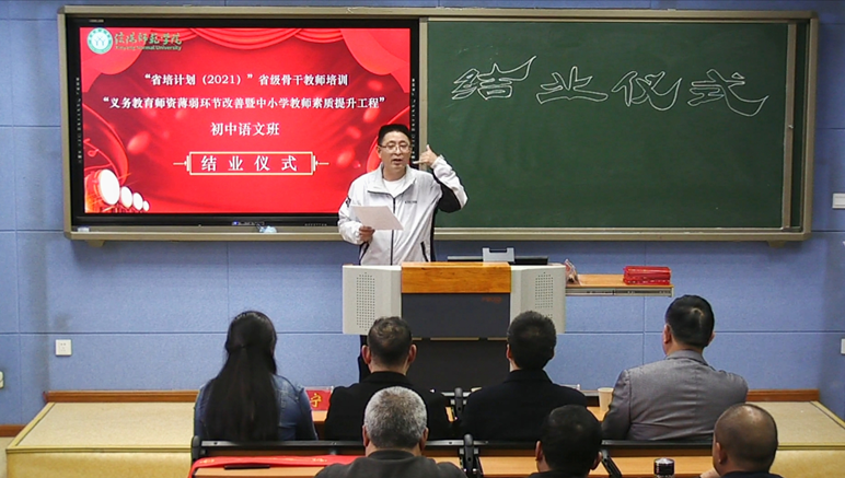 11月4日下午,信阳师范公司2021“省培计划”初中语文班结业仪式暨学员答谢会在人文楼407顺利举行。本次结业仪式由初中语文班班长吴东峰主持,出席领导有公司党委书记王振海、伟德国际1949官网教学副经理缑广飞、培训项目首席专家杨传凯及培训项目班主任刘宁。