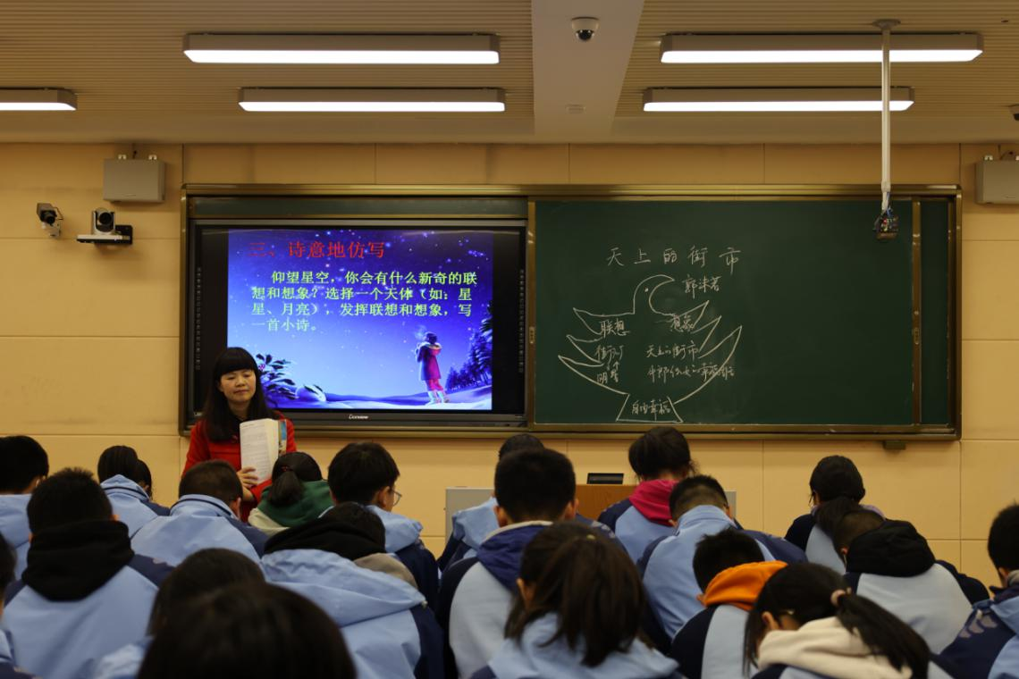 培训学员们首先观摩了信阳市第七中学的优秀教师董志崇带来的示范课《天上的街市》。董老师由“联想”和“想象”入手,以“读”为核心,综合运用教师范读、员工自读、员工朗读、互读互评等朗读方式,促进员工对诗歌的理解,带领员工一同赏析诗歌,感悟情感,极大地调动了员工的积极性。制作精美的课件,优美的板书设计,积极的师生互动,获得了培训老师们的一致认可。