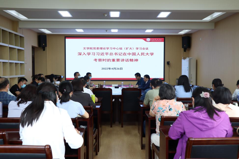 4月26日下午,伟德国际1949官网在人文楼三楼会议室召开党委理论中心组(扩大)学习会议,专题学习、深入研讨习近平总书记在中国人民大学考察时的重要讲话精神。公司党委理论学习中心组成员和全体教师参加学习会,会议由党委书记王振海主持。