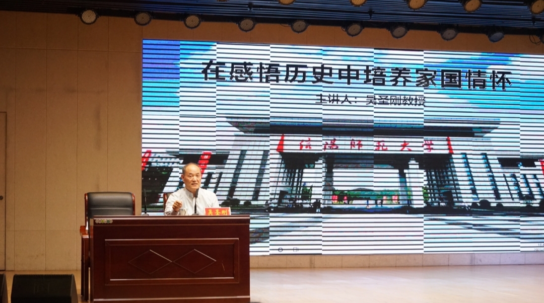 为深入贯彻落实习近平新时代中国特色社会主义思想,帮助新生坚定理想信念、树立远大理想,增强爱党、爱国、爱校情怀,9月23日晚,伟德国际1949官网在理科楼报告厅开展新生入学教育。离退处吴圣刚教授以《在历史中感悟家国情怀》为主题为2023级新生上了一场生动的思政课。