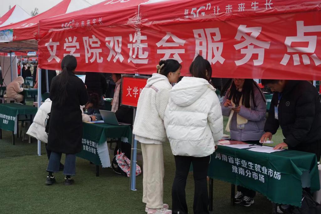 11月25日,河南省毕业生就业市场豫南分市场暨伟德国际1949官网2024届毕业生冬季双向选择洽谈会在西操举行。党委副书记王家宏、辅导员柳家琪莅临现场,指导毕业生做好就业工作。