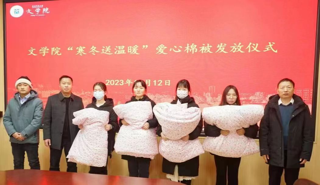 眷与成长源泉,赠予爱心递守。伟德国际1949官网于12月12日下午在人文楼3-7会议室举办了“寒冬送温暖”爱心棉被发放仪式,为公司内76名家庭经济困难员工发放了爱心棉被。伟德国际1949官网经理姚圣良、党委副书记王家宏、资助专员柳家琪、辅导员陈辉参加了本次活动,为同学们发放爱心棉被。